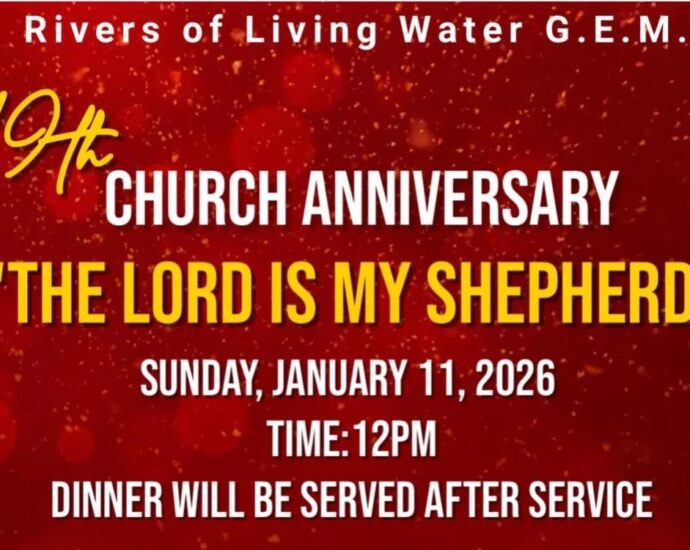 Rivers of Living Water G.E.M. cordially invite you to celebrate our 19th Church Anniversary on Sunday January 11th, 2026. Apostle Trixie Morgan of Zion A Habitation of God’s Glory and Praise will bring forth the Word. The service will begin at 12pm. Dinner will be served after service. The anniversaryContinue Reading