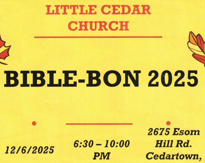 Little Cedar Church invites you to their first annual Bible-Bon outdoor fellowship fundraiser! December 6 from 6:30-10 p.m. All you can eat soup and chili for $10 per person. Drinks sold Separately. True gospel preaching, testimonials, and story telling! Come and have a good time in the Lord. Bring yourContinue Reading