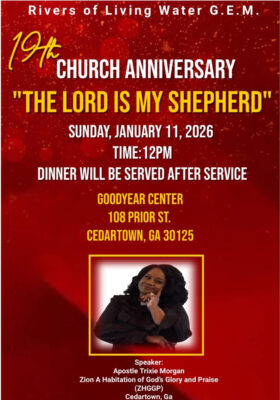 Rivers of Living Water G.E.M. cordially invite you to celebrate our 19th Church Anniversary on Sunday January 11th, 2026.