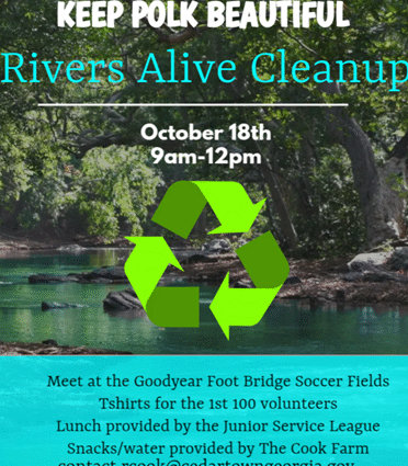 October 18 9 a.m.. – 12 pm. Goodyear Foot Bridge Soccer Fields Lunch provided by the Junior Service League. Snacks/water provided by the Cook Farm Contact: rcook@cedartowngeorgia.gov. Continue Reading